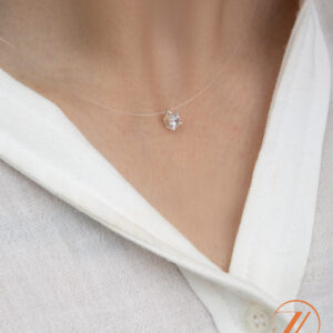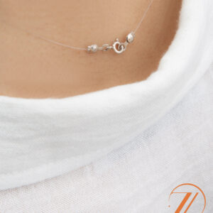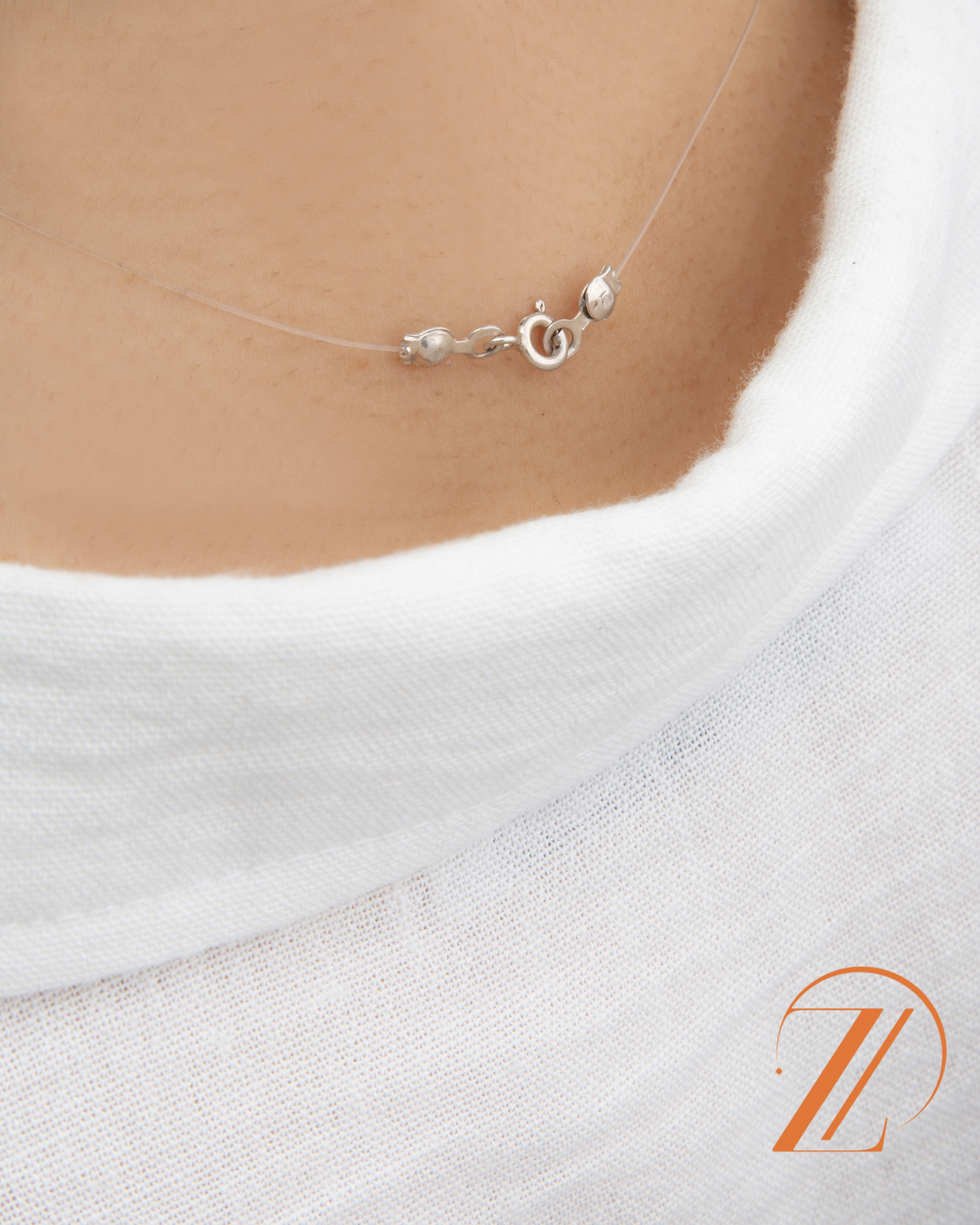نخ نامرئی که همان نخ ماهیگیری است. در ابتدا ممکن است سفت یا کمی خمیده به نظر برسد، اما با رطوبت و کمی گرمای بدن شما، کاملاً صاف میشود و صاف روی سینه و دور گردن مینشیند.